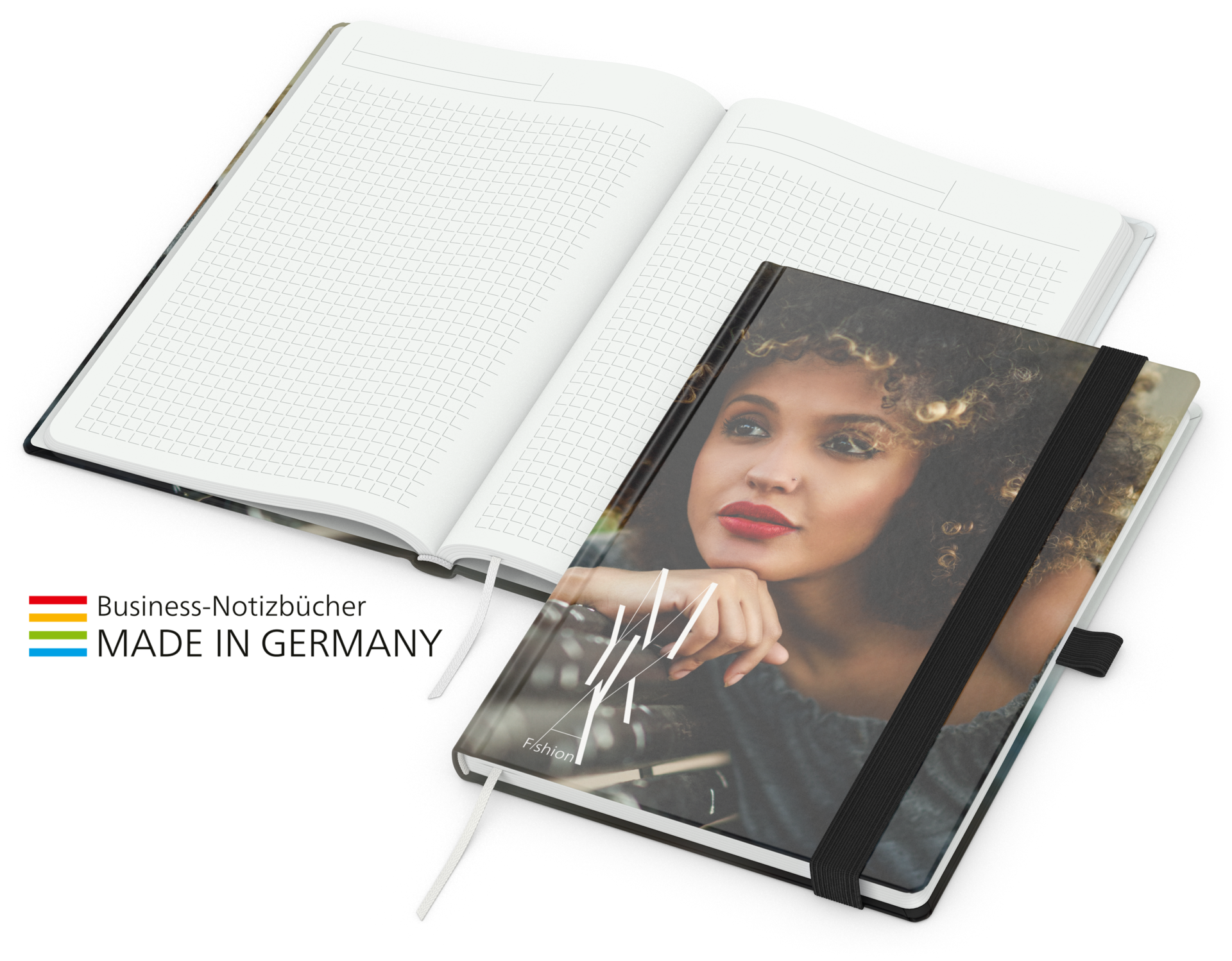 Zur Wahrung einer einheitlichen Corporate Identity: Match-Book green+blue mit Recycling-Schreibpapier, hergestellt aus 100 % Altpapier mit dem Umweltzeichen „Blauer Engel“, Gummiband sowie Stiftschlaufe in einer von 8 attraktiven Farben – individuelle Werbung in 4C-Quality Digital auf dem kompletten Einband inklusive